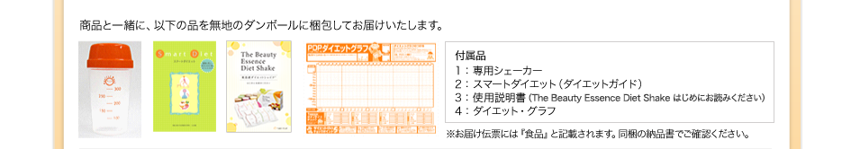 商品と一緒に、専用シェーカー、スマートダイエット(ダイエットガイド)、使用説明書(All About PDP)、ダイエット・グラフを無地のダンボールに梱包してお届けいたします。